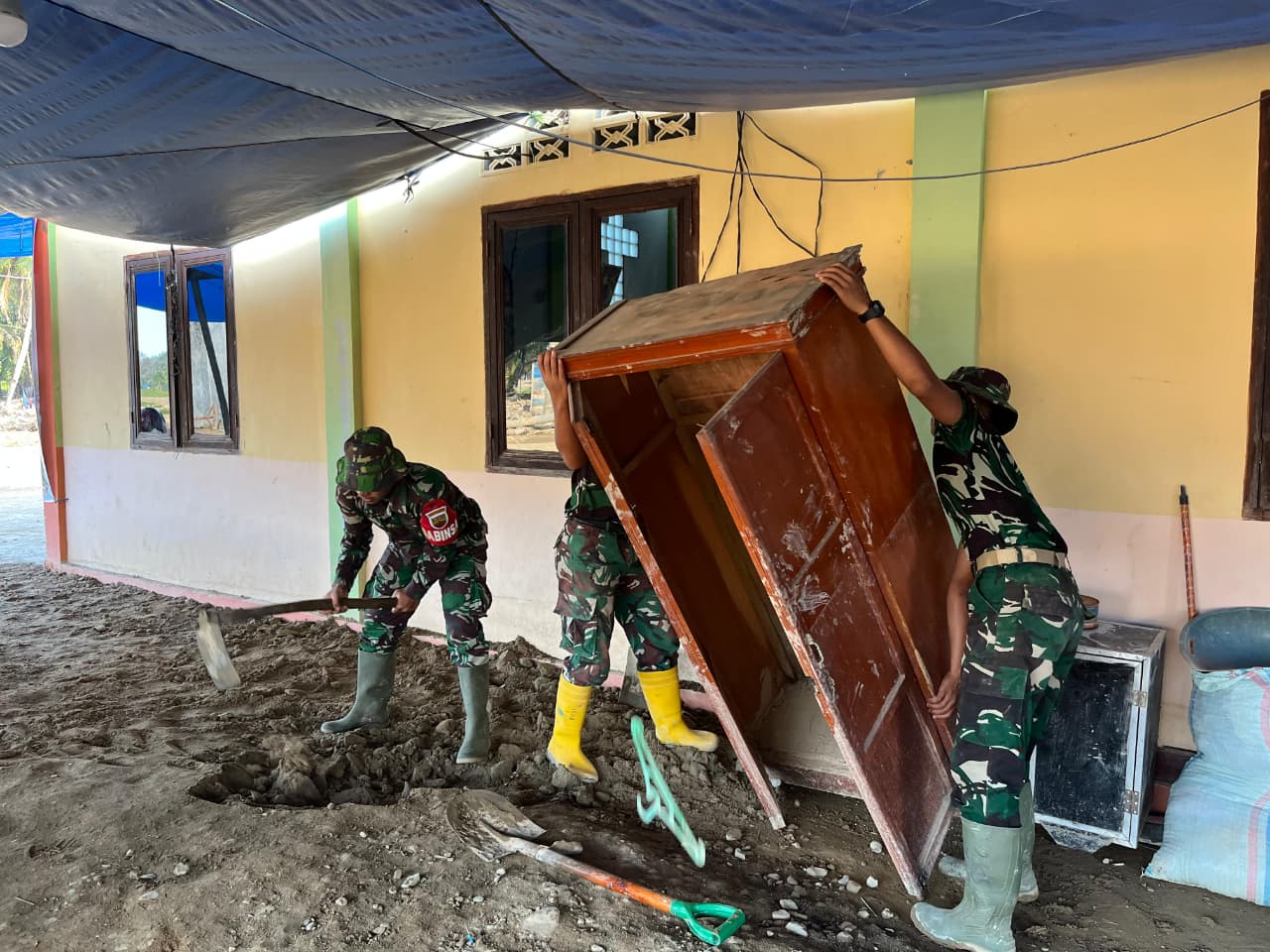 Personel Satgas dari Kodim 0212/Tapanuli Selatan bersama Yon TP 901/TS melaksanakan pembersihan material lumpur yang menutup halaman dan fasilitas sekolah akibat terjangan arus banjir. Seluruh area dibersihkan secara gotong royong hingga lingkungan sekolah kembali tertata rapi dan siap digunakan.
