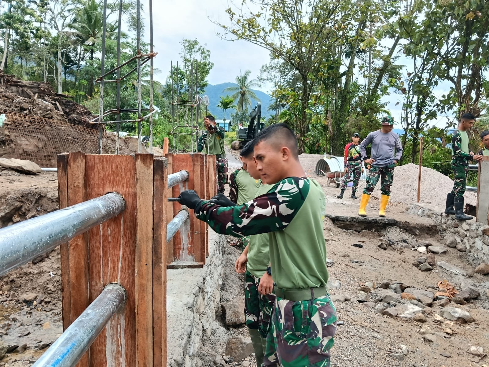 Pembangunan jembatan melibatkan personel Yonif TP 897/SGL, Kodim 0304/Agam, dan Zidam XX/TIB, yang bekerja bahu-membahu bersama masyarakat. Sinergi ini menjadi bukti kemanunggalan TNI dengan rakyat dalam percepatan pemulihan pascabencana.