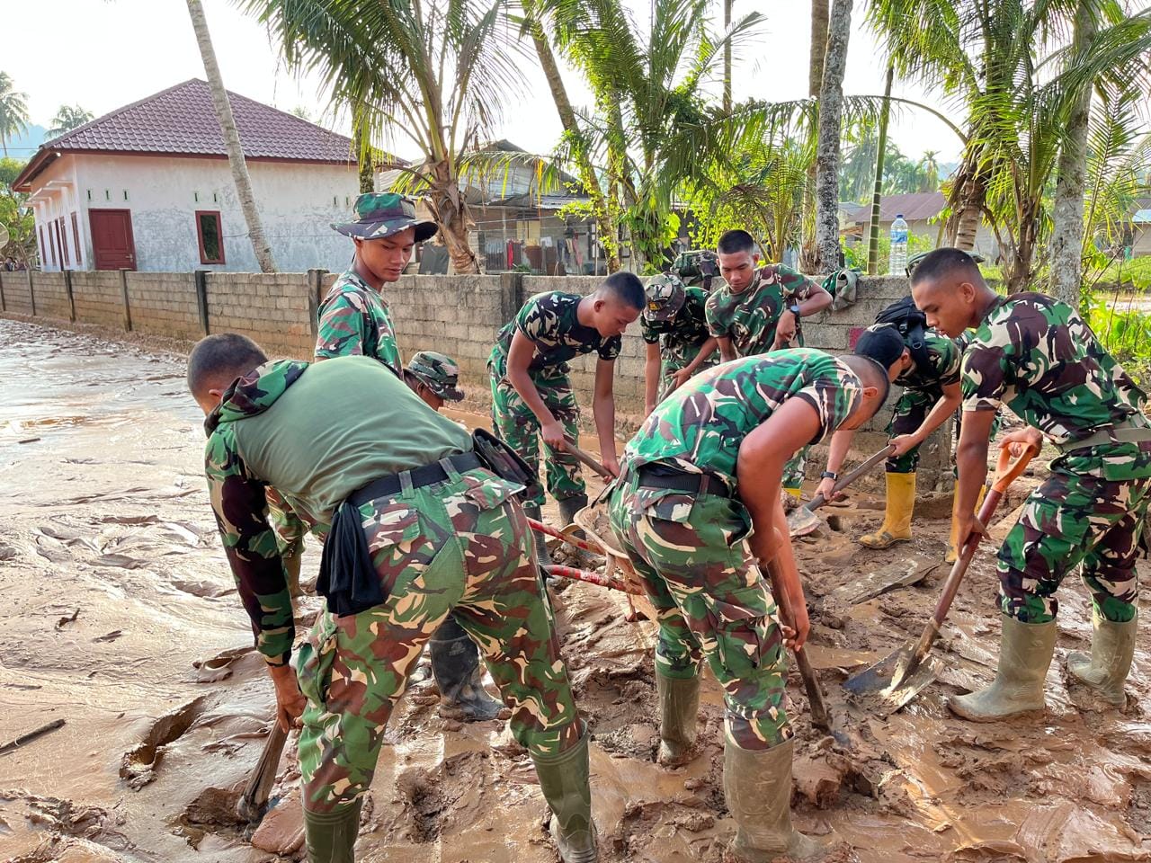 Prajurit TNI bersama unsur terkait bahu-membahu mengangkat material lumpur yang menggenangi ruang kelas dan halaman sekolah, sehingga lingkungan pendidikan kembali bersih, aman, dan layak digunakan. Langkah ini menjadi wujud nyata komitmen TNI AD dalam membantu masyarakat, khususnya memastikan proses belajar mengajar dapat segera kembali berjalan normal.